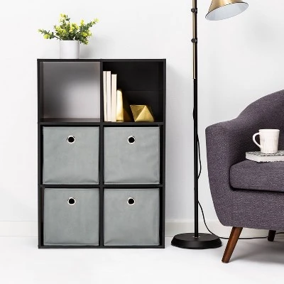 Stack away the extras out of sight in this 4-Pack of 11-Inch Fabric Bins Bundle from Room Essentialsâ˘. Designed in a cube shape, this four pack of fabric bins easily fits in a cube shelf to help you save space and stay organized while storing your craft supplies, extra light bulbs, or other odds and ends. The round cutouts with silver-tone accents make the bins easy to pull out from the shelf. Lightweight and simple, this gray fabric bin bundle lends a sophisticated touch to your space. You can also place cube fabric bins throughout your home for pop-up storage, including on your desktop for office supplies or near your sofa to stash remotes and more.