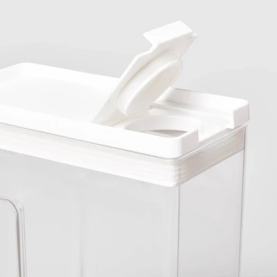 Perfect for cereal, oats, rice and other dry goods, this Clear Plastic Food Storage Container with Snap Lid from Brightroomâ„¢ will make a great addition to your pantry, shelf or kitchen counter. This 8″ x 4″ x 11.5″ simple, clear canister has a clean look and stackable design to save you space and make your everyday kitchen and pantry essentials easy to find. An indented back lets you easily lift and hold the container. This handy food storage container has white snap lid with pour spout to keep your food fresh and give you easy access to contents. Hand wash only.