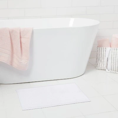 Bring a comfy, cozy feeling to your everyday routine with this Everyday Chenille Bath Rug from Room Essentialsâ˘. The plush, looped pile feels great on your feet, while its ultra-absorbent tufted construction protects your floors from dripping water while you’re stepping out of the shower or getting ready by the sink. Featuring a simple chenille design in a solid hue, this rectangular bath rug easily blends with your existing decor, while the machine-washable design makes for easy maintenance.