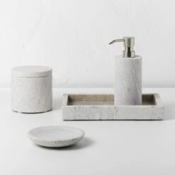 Add function and style to your bathroom decor with this Marble Soap Dish from Casaluna™. Designed in a round silhouette, this soap dish features an open design to let you easily access the bar of soap in the shower, while protecting it from coming in direct contact with wet surfaces. Showcasing a rugged marble finish in white and a sleek design, it’s sure to effortlessly blend with a variety of bathroom decor styles. Simply add a coordinating bath tray, canister or soap pump to your bathroom sink for a cohesive look.