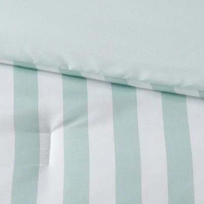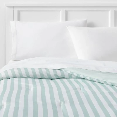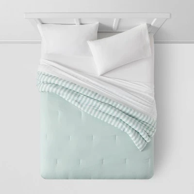 Bring a soothing look to your bedroom with this Microfiber Reversible Stripe Comforter Room Essentialsâ˘. This double-sided comforter brings comfort and style to your bedding ensemble. It features contemporary mint stripes on one side and a solid mint reverse to instantly switch up the look of your bed. The microfiber fabric construction with soft fill interior offers comfortable year-round use, and is machine washable for easy care. Pair with matching shams and white sheets to coordinate your bedding ensemble.