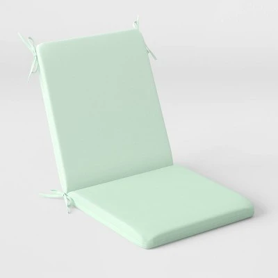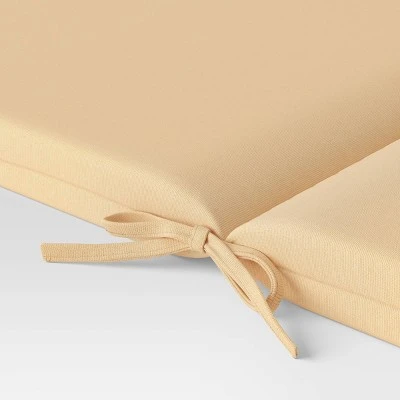 Combine comfort and style to your patio with the Outdoor Chair Cushion from Room Essentials™. This hinged chair cushion helps you create a comfy spot for reading a good book, enjoying a meal in the sun and more. Designed in a solid hue for easy integration into any outdoor setting and any decor theme, this water-resistant cushion features rounded corners with a knife edge as well as attached ties.