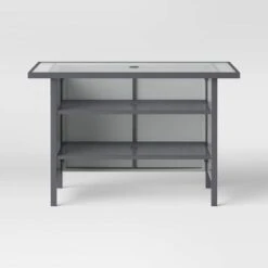 Set up a bar in your patio or backyard with this Patio Bar Table from Room Essentialsâ˘. Set on a gray metal frame, this bar table comes with a glass tabletop for a simple yet elegant look you’ll love adding to your outdoor space. The two built-in shelves offer plenty of space for your glasses, wine bottles and other bar accessories while providing easy access to them with the open design. Simply add bistro chairs of your choice to create a complete set up for enjoying drinks alone or with a loved one.