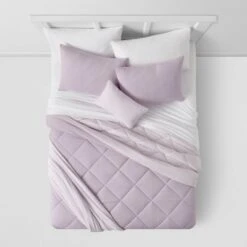 Adorn your sleep space with this Solid Microfiber Reversible Decorative Bed Set with Throw from Room Essentials™. This comforter bedding set featuring a quilted diamond pattern revives your bedroom style with a blend of modern texture and comfort. Including matching sham(s) with envelope closure, one decorative pillow, microplush throw and a comforter, this complete bedding set is easy to coordinate. The faux-fur pillow with microsuede reverse adds a layer of soft texture, while the comforter and sham in brushed microfiber lend cozy warmth as you lie down or recline in bed. Plus, the set is simply machine washable for easy home care.