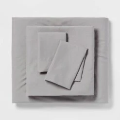 Bring comfort and style to your master suite or guest bedroom with this 5-Piece Stripe Microfiber Reversible Comforter & Sheet Set from Room Essentialsâ˘. This twin extra-long bedding set includes a microfiber comforter, pillow sham, pillow case, flat sheet and fitted sheet for a coordinated look. The bedding set features an allover gray and white stripe pattern for a cool look, and it reverses to a solid hue to instantly change the look of your space. For added convenience, the multi-piece comforter bedding set boasts a lightweight and breathable fabric for year-round use and is machine washable.