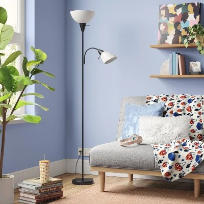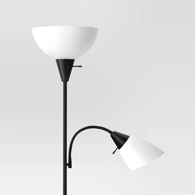 This Torchiere with Task Light Floor Lamp from Room Essentials⢠can be placed near an armchair, bedside or desk. It features an upward-facing white bowl shade that’s attached to a slim metal stand with a pedestal base, and it comes with a fully adjustable reading light so that the light can be positioned where it’s most needed. The turn-knob rotary switch with on/off light setting offers easy function, and the included LED bulbs allow for immediate use.