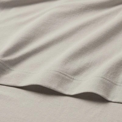 Update your bedscape with this Jersey Sheet Set from Room Essentialsâ˘. This three-piece bedding set includes one fitted sheet, one flat sheet and one pillowcase, all in a solid hue for easy pairing with just about any comforter, pillow and decor style. Each piece is made from soft jersey fabric with a cotton-blend construction for year-round comfort, along with a machine-washable design for quick and easy cleanup.