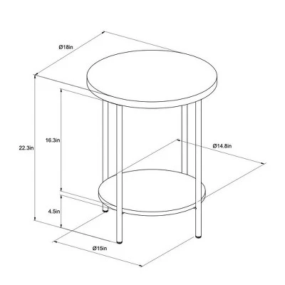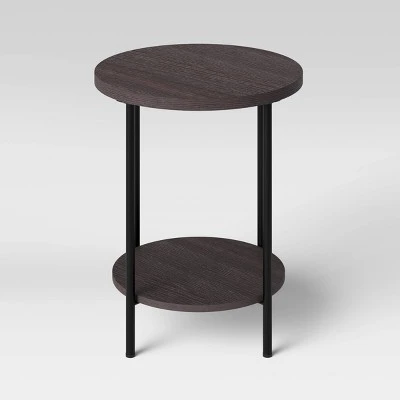 Bring a blend of modern and industrial style into your home with this Wood and Metal Round End Table from Room Essentials™. This practical end table makes a perfect addition to any living room decor. It features a rounded shape with a sleek and airy structure for a chic modern look. The wooden tabletop and a lower shelf provide plenty of room for storage and display, while the solid metal frame brings an industrial element of style. Place it next to your sofa in your living room or alongside your favorite comfy chair to rest your book, cup of tea, small potted plant or a lamp.